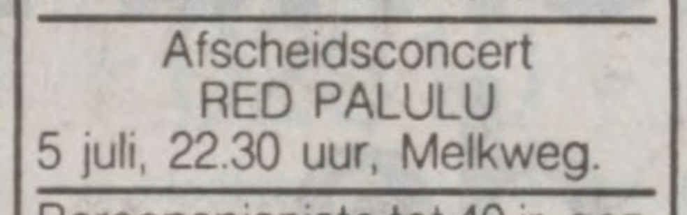 De band speelt haar afscheidsconcert in de Melkweg. Op 5 juli 1987. Doris: “Onze band ging later over in de band Yaya’s. Daar zaten toen ook zangeres Joyce Cordus, eerst bassist Sbiti Abderrazak en later bassist Iwan Hoogwoud, en gitarist Robin Leek bij.”